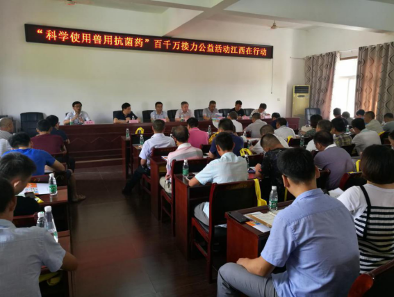 为响应全国“科学使用兽用抗菌药”百千万接力公益行动,2018年8月30日,由江西省畜牧兽医局主办,江西兽药制剂产业技术创新战略联盟、九江市畜牧兽医局、瑞昌市畜牧水产局承办,江西爱游戏平台大药厂有限公司、江西派尼生物药业有限公司、江西邦诚动物药业有限公司协办的江西省“科学使用兽用抗菌药”百千万接力公益行动启动仪式在瑞昌市举行。江西省畜牧兽医局医政药政处黎建华处长、九江市畜牧兽医局张付华局长应邀参加活动,瑞昌市畜牧兽医技术人员、养殖场负责人等80余人参加了此次启动仪式。